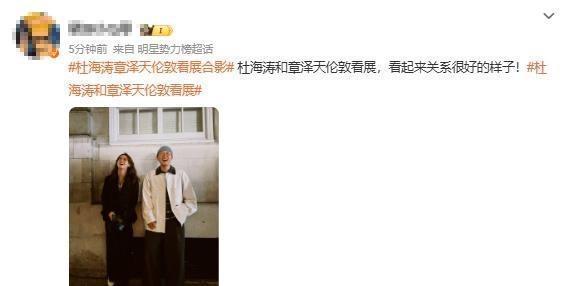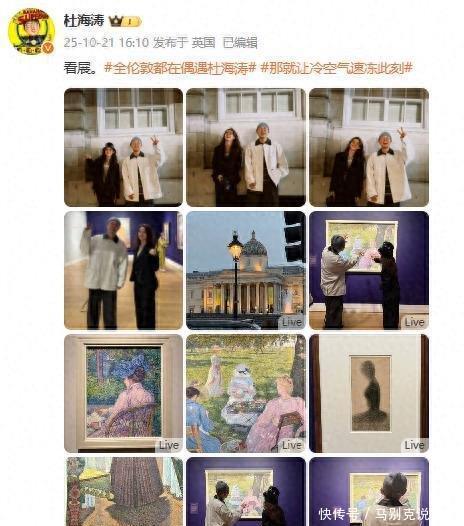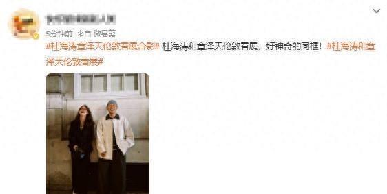 今天有人在伦敦拍到杜海涛和章泽天一起看展览,两人站在一起拍照,没说话也没怎么互动,就跟普通观众一样,照片是杜海涛自己发的,没提合作,也没带品牌,就是随手一晒。